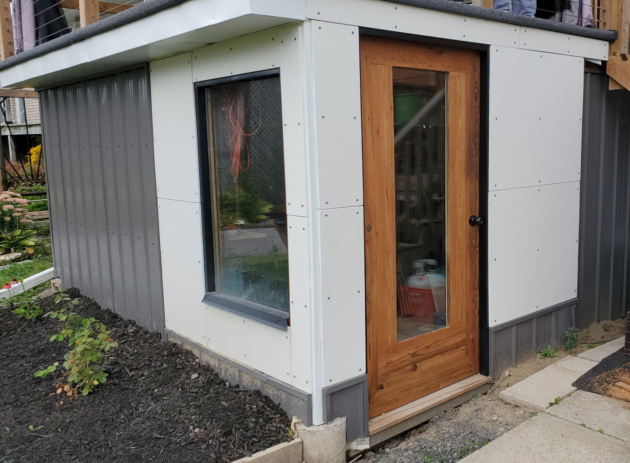 This custom shed door is built from recycled cedar deck boards and a window saved from the previous windows upgrade replacement.