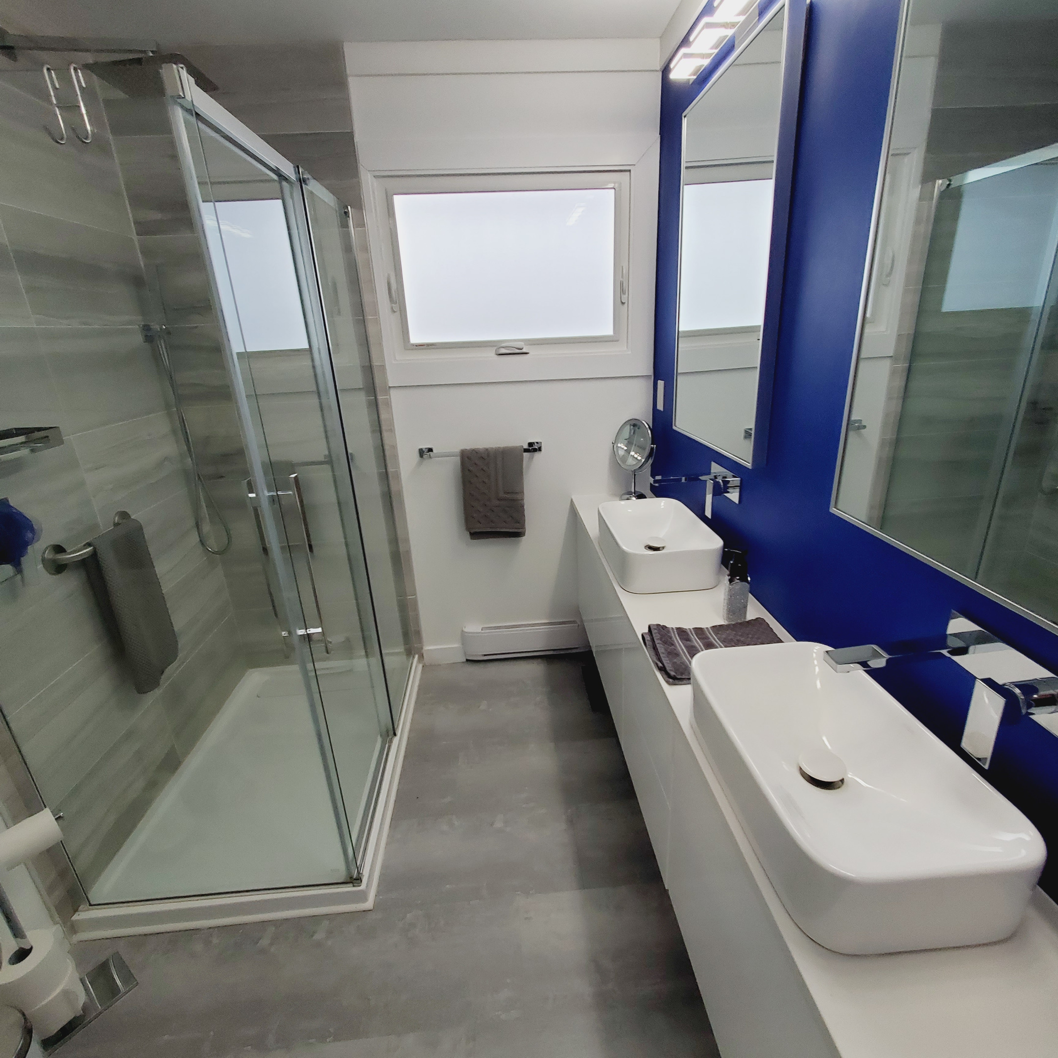 The existing bathroom width had to be reduced to make space for an adjacent room. By moving the toilet to where a under utilized linen was, adding two 10 inch deep vessel sinks and installing wall faucets, this room feels as large as it was and is now much brighter.
