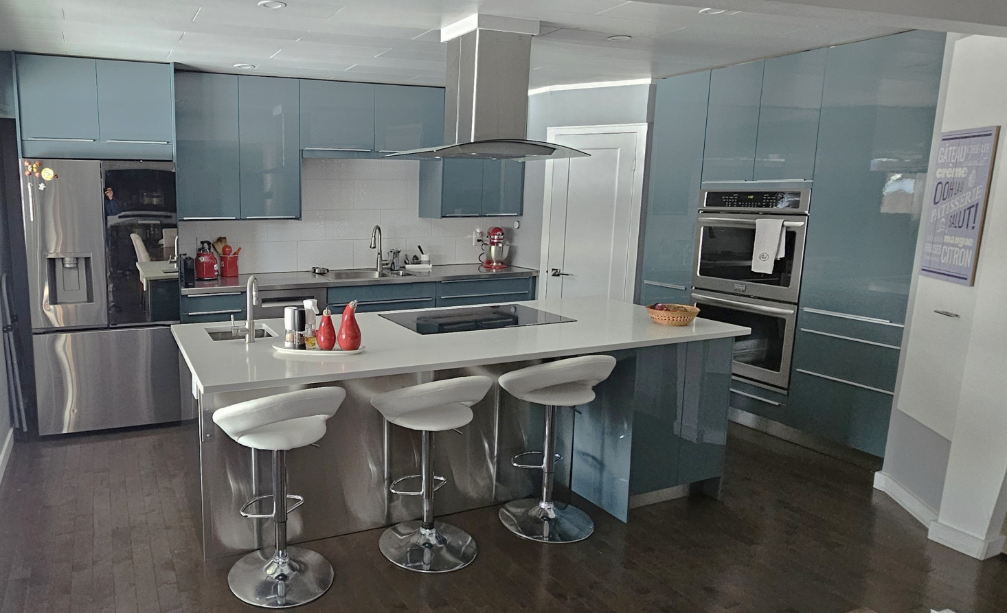This wine cellar has modern flair and can store over 90 bottles. It sits at the bottom of the stair where a large space was not utilized due to the emplacement of an electrical panel. The large picture hides the panel.