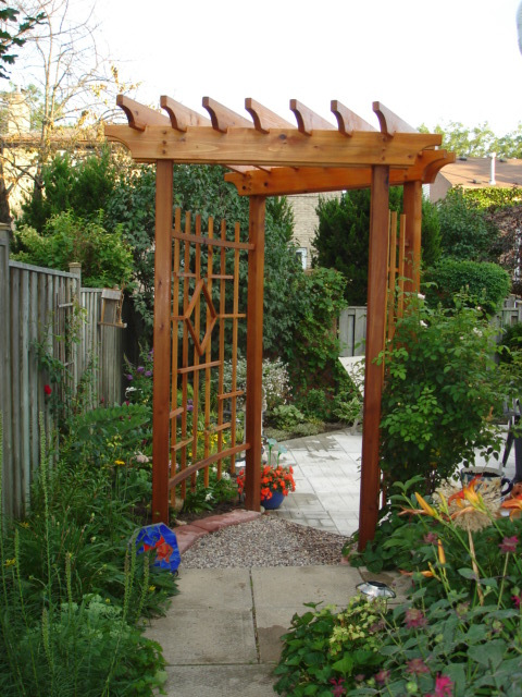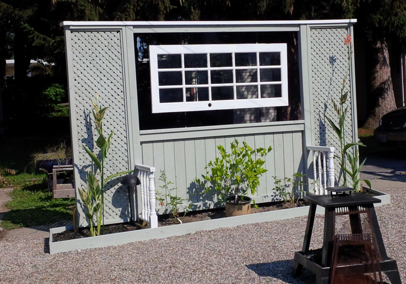 This wall screen provides a separation from the driveway to the gravel sitting area. An old french door and old railing parts were recycled into this project.