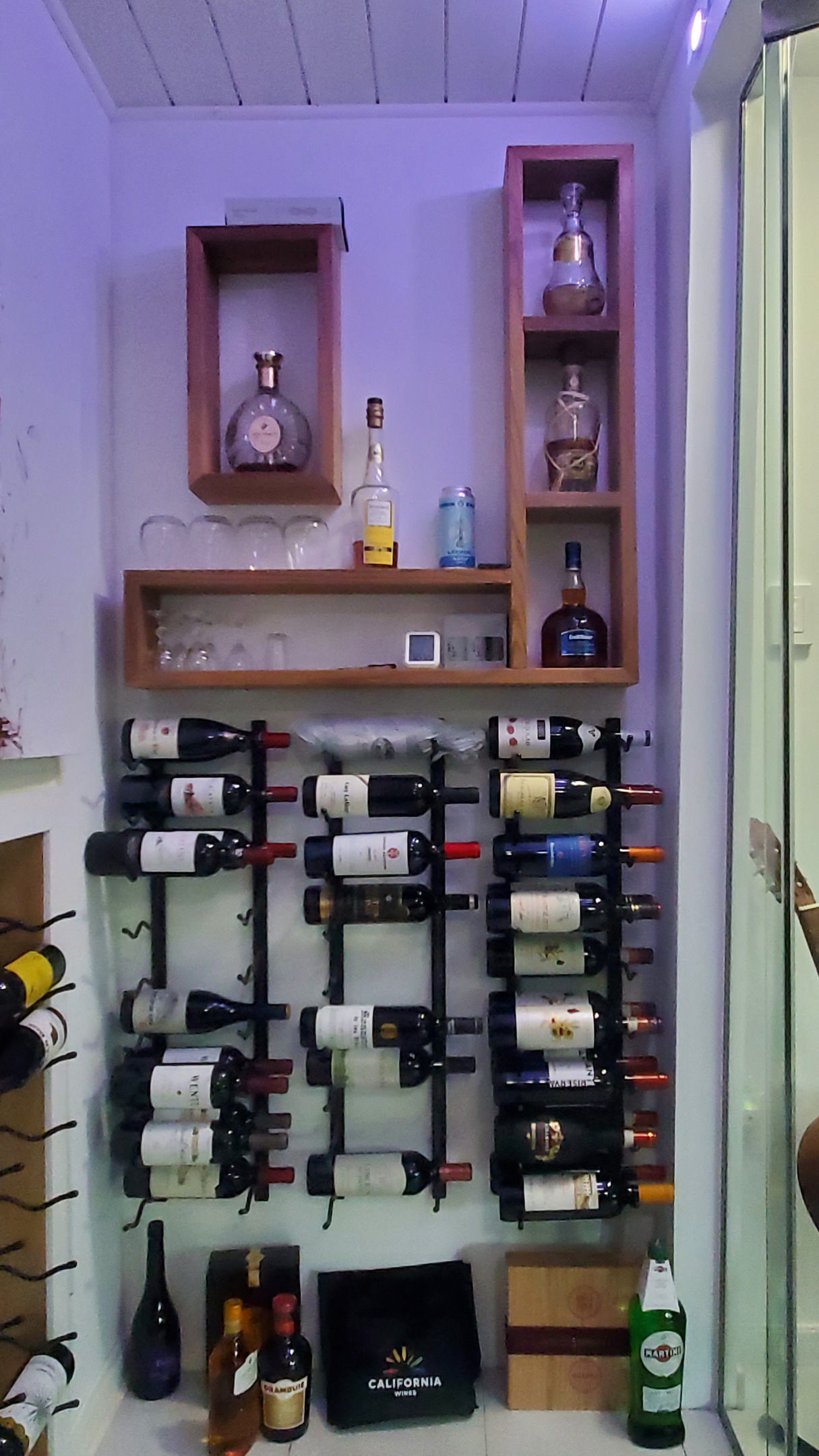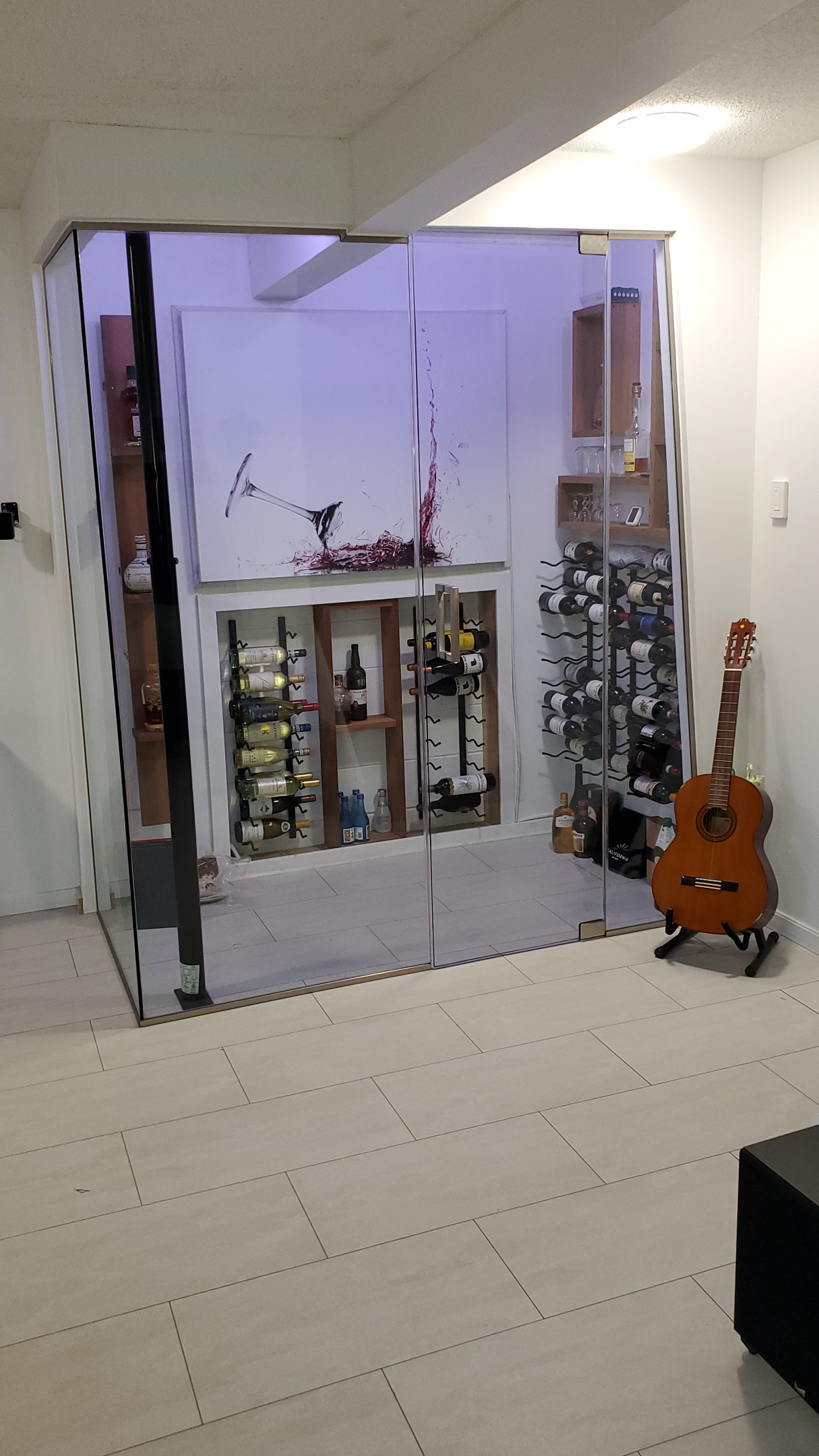 This wine cellar has modern flair and can store over 90 bottles. It sits at the bottom of the stair where a large space was not utilized due to the emplacement of an electrical panel. The large picture hides the panel.