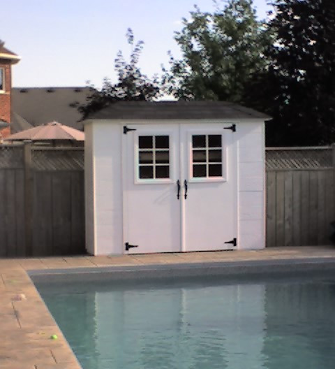 This homeowner was looking for a pool shed to store pool accessories. A narrow shed was needed to respect the minimum setback required by the municipality. Shed dimension are 8’ wide by 3’ deep.