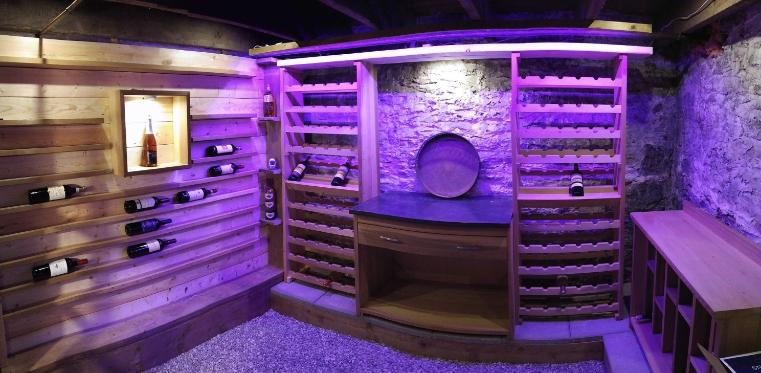 This century home has a dirt basement and a low ceiling. Dirt was removed to add head space for a tasting room and a wine cellar. The project features the exposed stone foundation. All racking, shelving and cabinets were custom built.