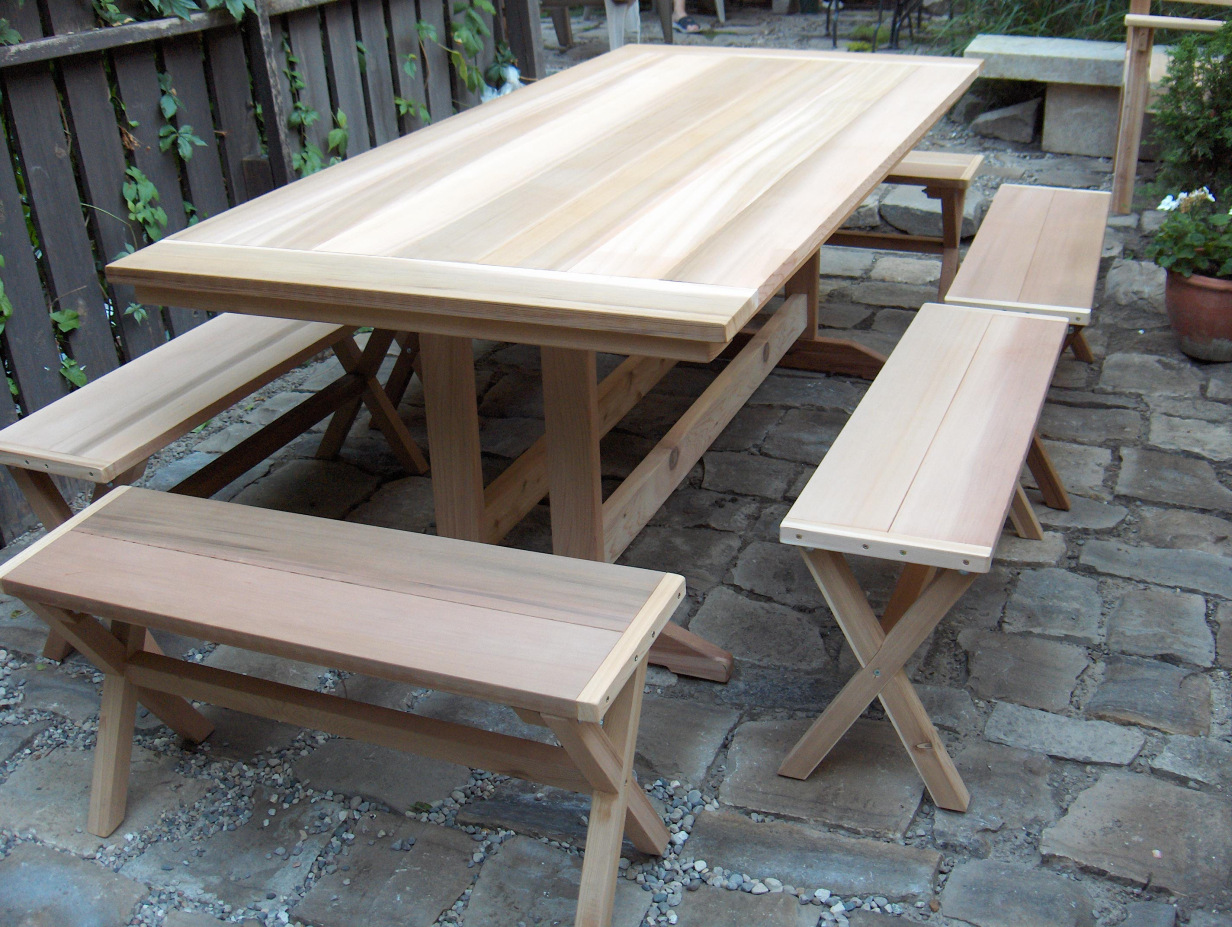 This exterior dining table was built for a homeowner who likes the look and feel of natural western red cedar.
