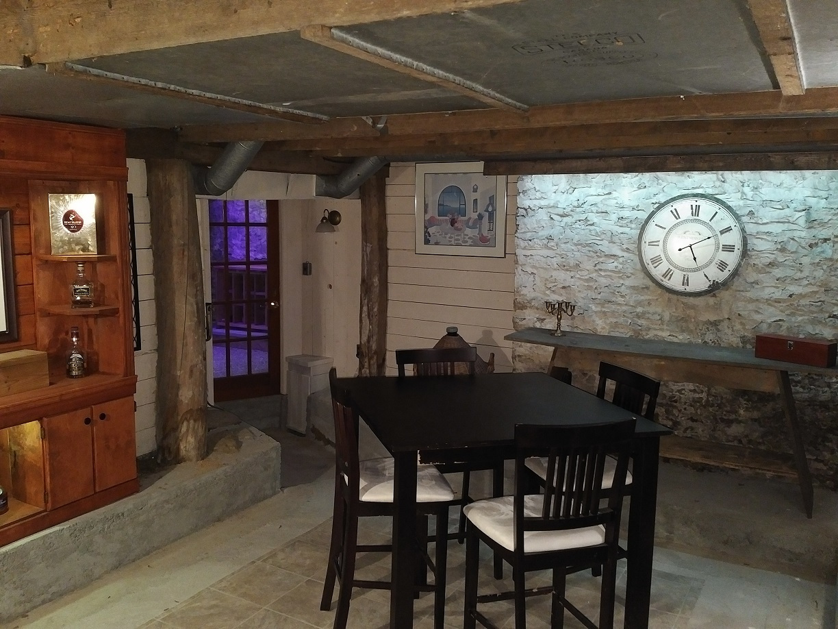 This century home has a dirt basement and a low ceiling. Dirt was removed to add head space for a tasting room and a wine cellar. The project features the exposed stone foundation. All racking, shelving and cabinets were custom built.
